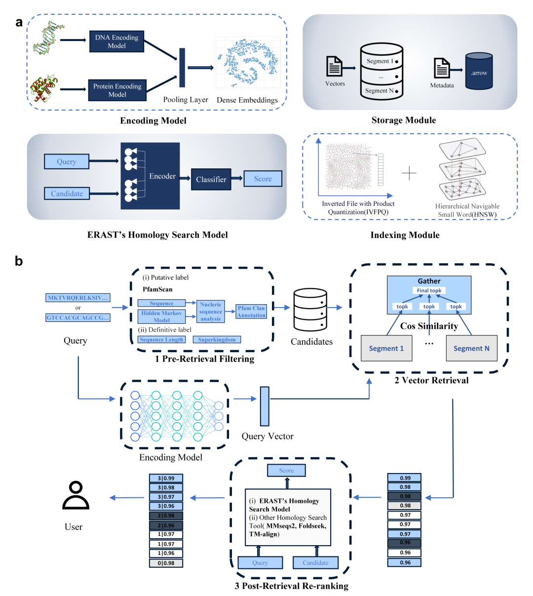 We propose ERAST, an LLM-empowered homology search tool with vector databases for ultra-fast, high-precision biological sequence retrieval at billion-scale.